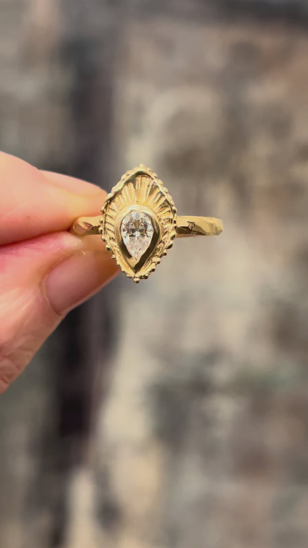 This regal ring design honours the sun. It is a nod to ancient textures and has the essence of treasure, while the contemporary, crisp stone cut sparkles brightly.  The combination creates a dreamy one of a kind design that would make a lovely engagement ring or just-because ring.